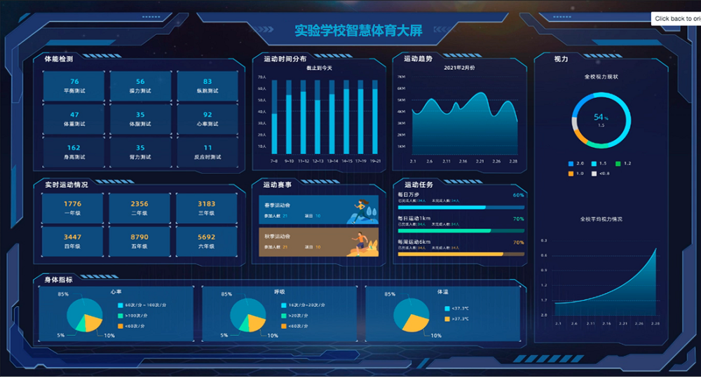 建设校级智慧体育运动管理平台,利用信息化和物联网技术提升学校体育教学效率和水平,丰富课后体育运动安排,帮助学生和家长详细掌握运动数据和身体健康状态,进行个性化的体育锻炼,同时基于大数据统计分析,为学校提供学生多维度身体健康数据报表,协助学校进行教育管理和政策制定。